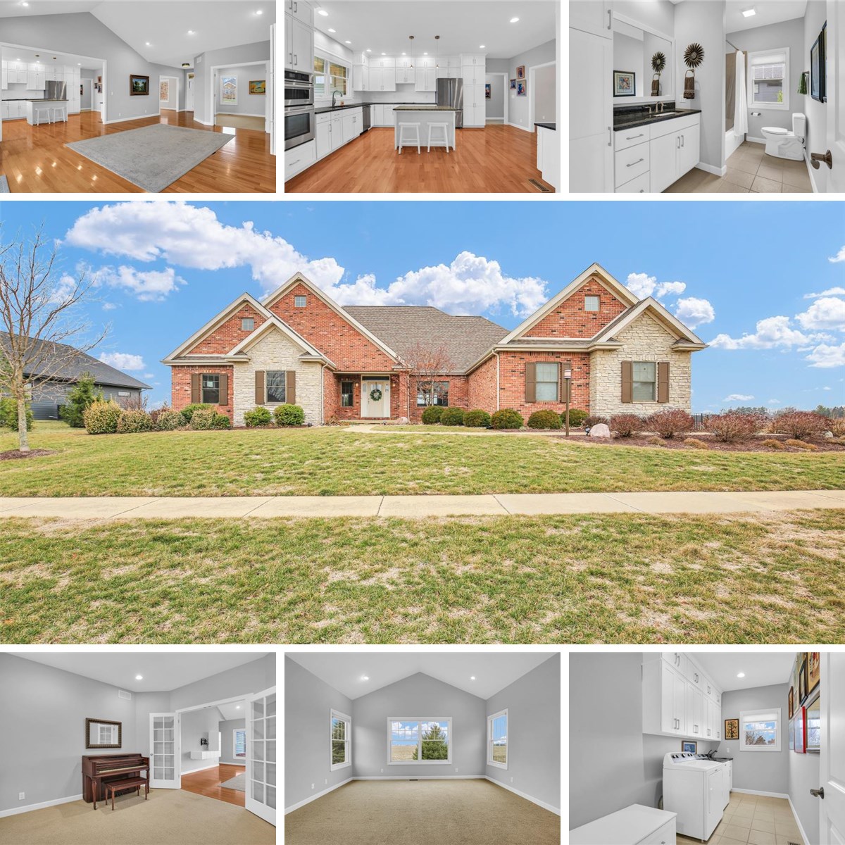 Welcome to 1409 Yorkshire in Savoy. This 1-story home is a perfect mixture of traditional design with a light contemporary touch. 3000 sqft of living space on the main floor plus a huge basement includes tall ceilings, open living spaces and spacious bedrooms plus a unique live-in suite that has private access to the exterior. This space allows a private living space for 1-2 people while still maintaining an easy connection to the main home. The great room in this home features a wall of windows and glass doors that face west where you will experience amazing sunsets and skylines. The covered porch outside these doors is the perfect spot to enjoy the views while staying out of the elements. Back inside you'll love your gourmet kitchen; a huge island for prep work and entertaining, loads of countertops and custom built cabinetry. A dedicated dining room sits near the front of the home with easy access from the kitchen. The master bedroom offers cathedral ceilings and windows that also take advantage of the views. The private bath includes a dual vanity and step-in tiled shower with Basco frameless glass shower doors and dual walk-in closets. The additional bedrooms include great closets and abundant space. One is situated off the main living room and works great as a piano room or private office with French doors. This amazing property sits on a corner lot in Wilshire with no neighbors to the west and easy access to the Wilshire Subdivision pond as well as nearby grocery stores, movie theater and schools. Details/Extras/Upgrades: Pella Proline windows, Hunter Douglas honeycomb shades, landscape design by Brown Woods & Associates, brick and Buechel Fond du Lac stone facade, white oak hardwood floors, JennAire appliances, new dishwasher and garbage disposal in 2024, Zoned hvac system for main house and separate suite.